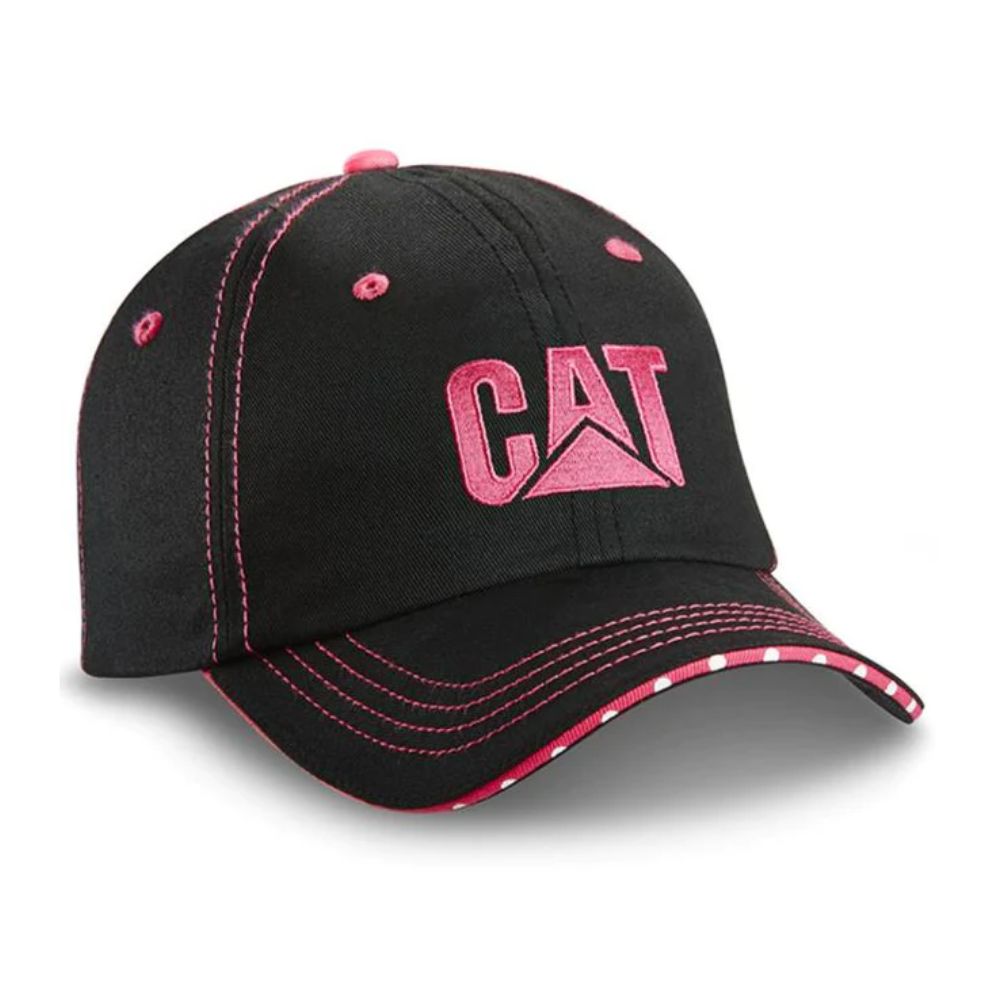 Gorra de sarga negra con pespuntes de color rosa intenso, sándwich de lunares y cierre de velcro de tela. Bordado